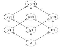 The last form of lattice-like structures to examine before we get to the applications are the lattices. These can represent factorized integers as well as set inclusion. It's a bit hard to imagine them, so when considering these structures, we can use what's called a "Hasse Diagram" to get an idea of how they work. Here is one for the elements of the set {x, y, z}: