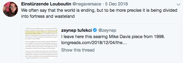 Climate change causes natural disasters, crop failures, war, and civil unrest. All of those things lead to migration. If we allow our current nationalism, racism, and fascism to endure, then we're looking at an incredibly violent response to the migrations to the US. And insofar as we can set the tone for the rest of the world, the same applies.
