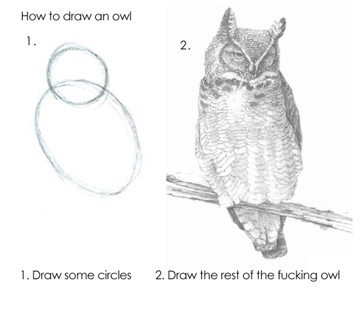 Our presentation and learning of tools goes a little like the owl drawing. In general, we don't lack for info on how to achieve step one or break down step two. I have some personal interest in how we approach step two within paradigms that I understand, but given around a decade to radically change how we live to avoid the worst effects of climate change, I think overall, our pickiness around tool use and choice is an incredible waste of time.